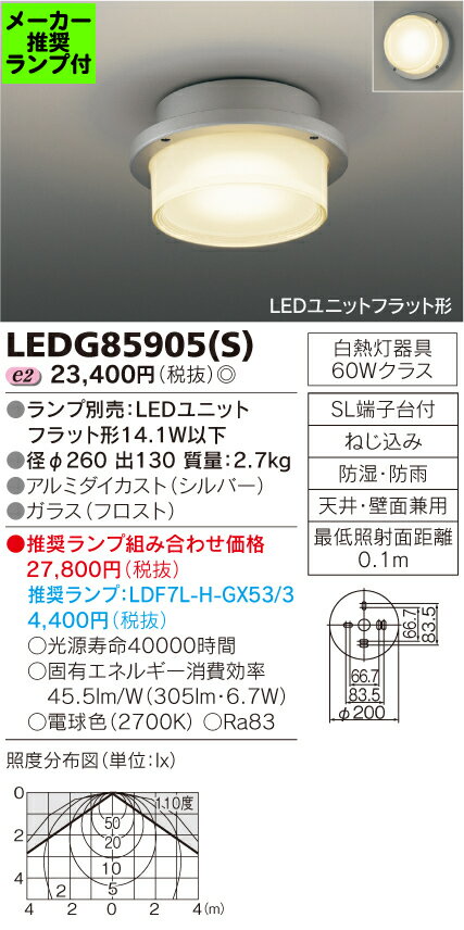 ◆LEDG85905(S) (推奨ランプセット)アウトドアライト LEDユニットフラット形 軒下シーリングライト傾斜天井対応 天井・壁面兼用 白熱灯器具60Wクラス東芝ライテック 照明器具 玄関 通路 勝手口用 屋外照明